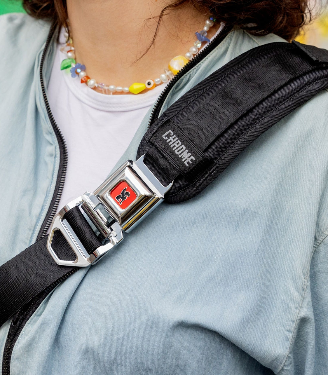 Seatbelt buckle design creates easy off and on of the bag without having to lift it over your head