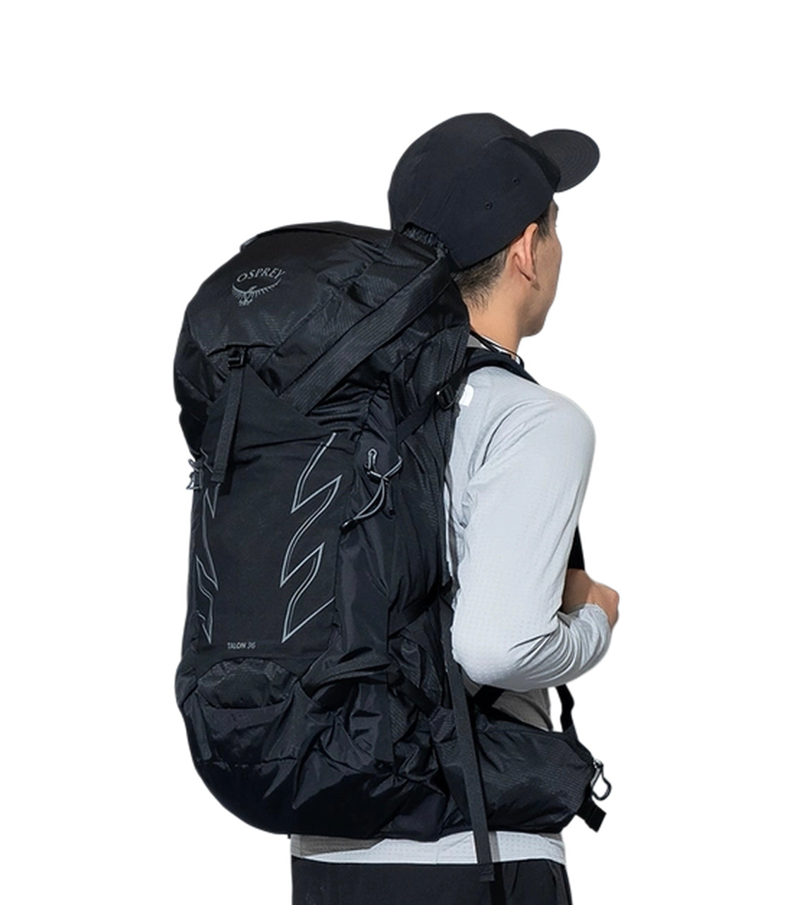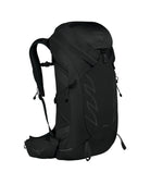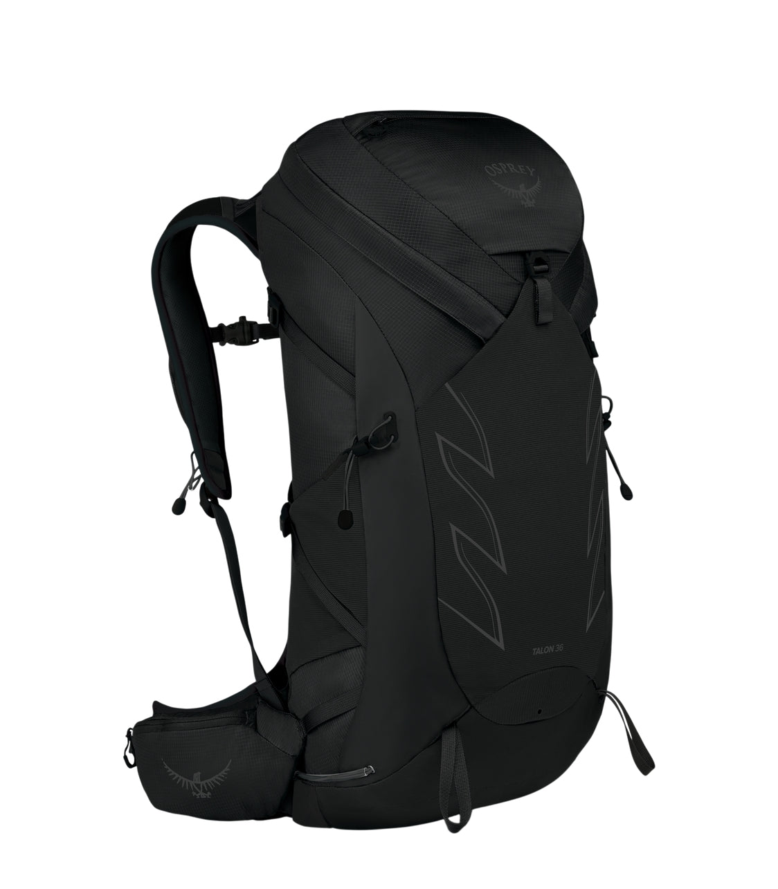 Osprey Talon 36 A backpack with a modern design, prominently displaying the Osprey logo on its top section. The backpack is designed for outdoor or hiking use, featuring multiple compartments and adjustable straps for comfort and convenience. Its streamlined shape and dark color give it a versatile and stylish appearance suitable for various outdoor activities. The backpack also includes a hip belt with additional storage pockets, enhancing its functionality for carrying essentials. Overall, it is a practical and aesthetically appealing backpack ideal for adventure seekers.