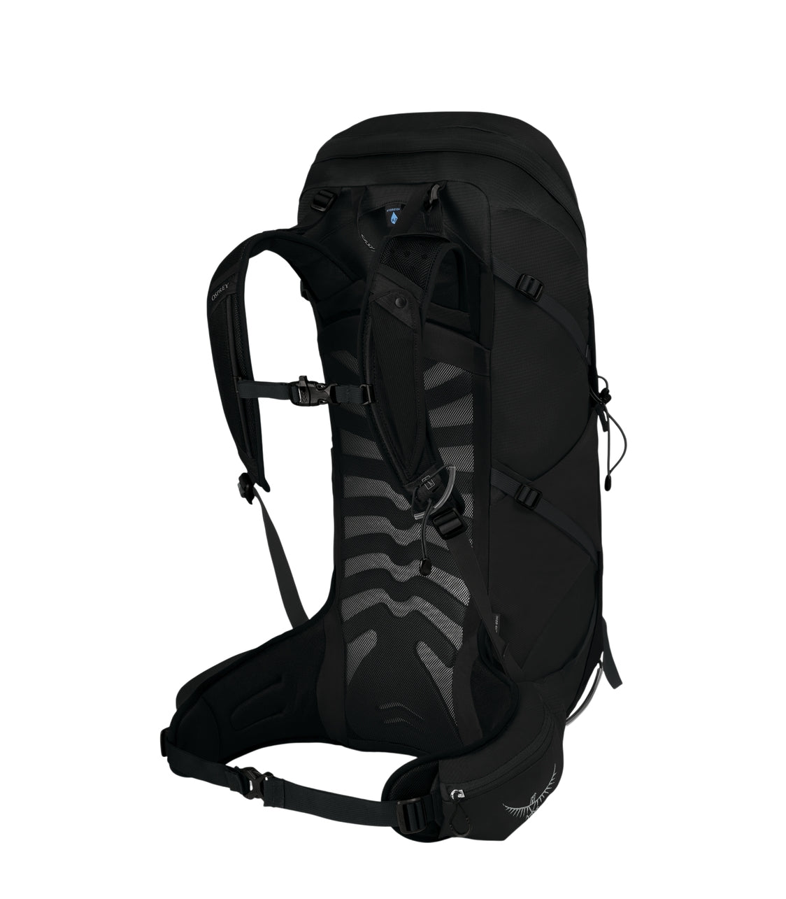 A backpack with a modern design, prominently displaying the Osprey logo on its top section. The backpack is designed for outdoor or hiking use, featuring multiple compartments and adjustable straps for comfort and convenience. Its streamlined shape and dark color give it a versatile and stylish appearance suitable for various outdoor activities. The backpack also includes a hip belt with additional storage pockets, enhancing its functionality for carrying essentials. Overall, it is a practical and aesthetically appealing backpack ideal for adventure seekers.