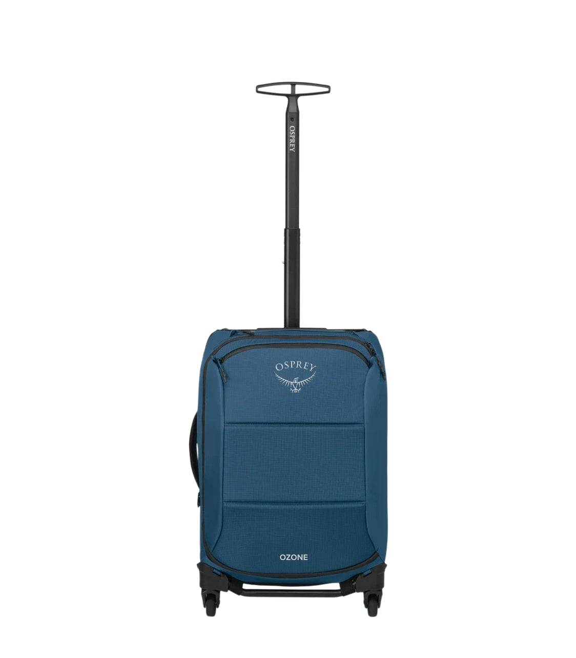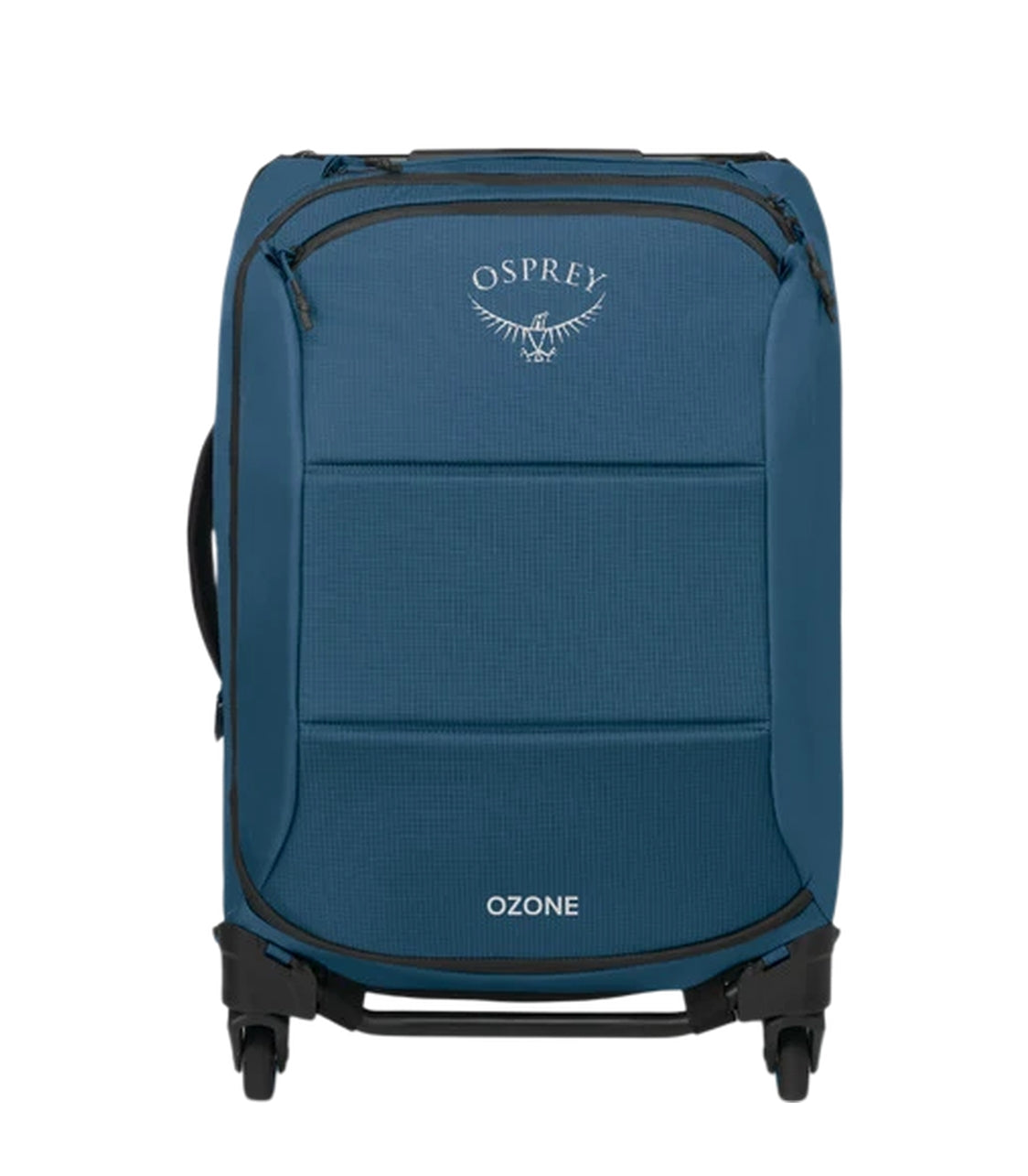 The Osprey Ozone luggage with a sleek and modern design. The luggage is displayed upright, showcasing its smooth, rectangular shape and durable exterior material. The Osprey logo is prominently featured near the top, and the word "OZONE" is displayed near the bottom. The luggage is equipped with four wheels, visible at the base, indicating it is designed for easy maneuverability. This particular piece of luggage seems ideal for travelers seeking a lightweight and functional option.