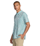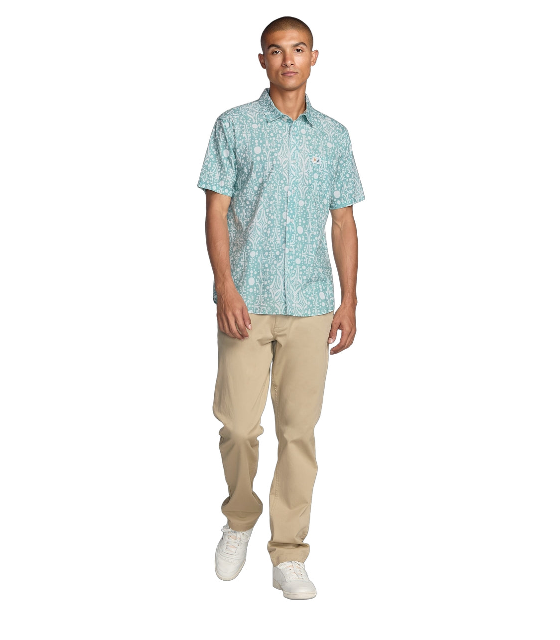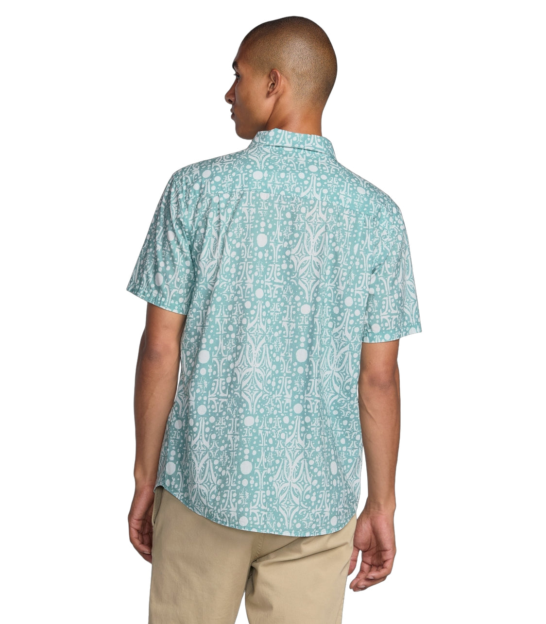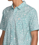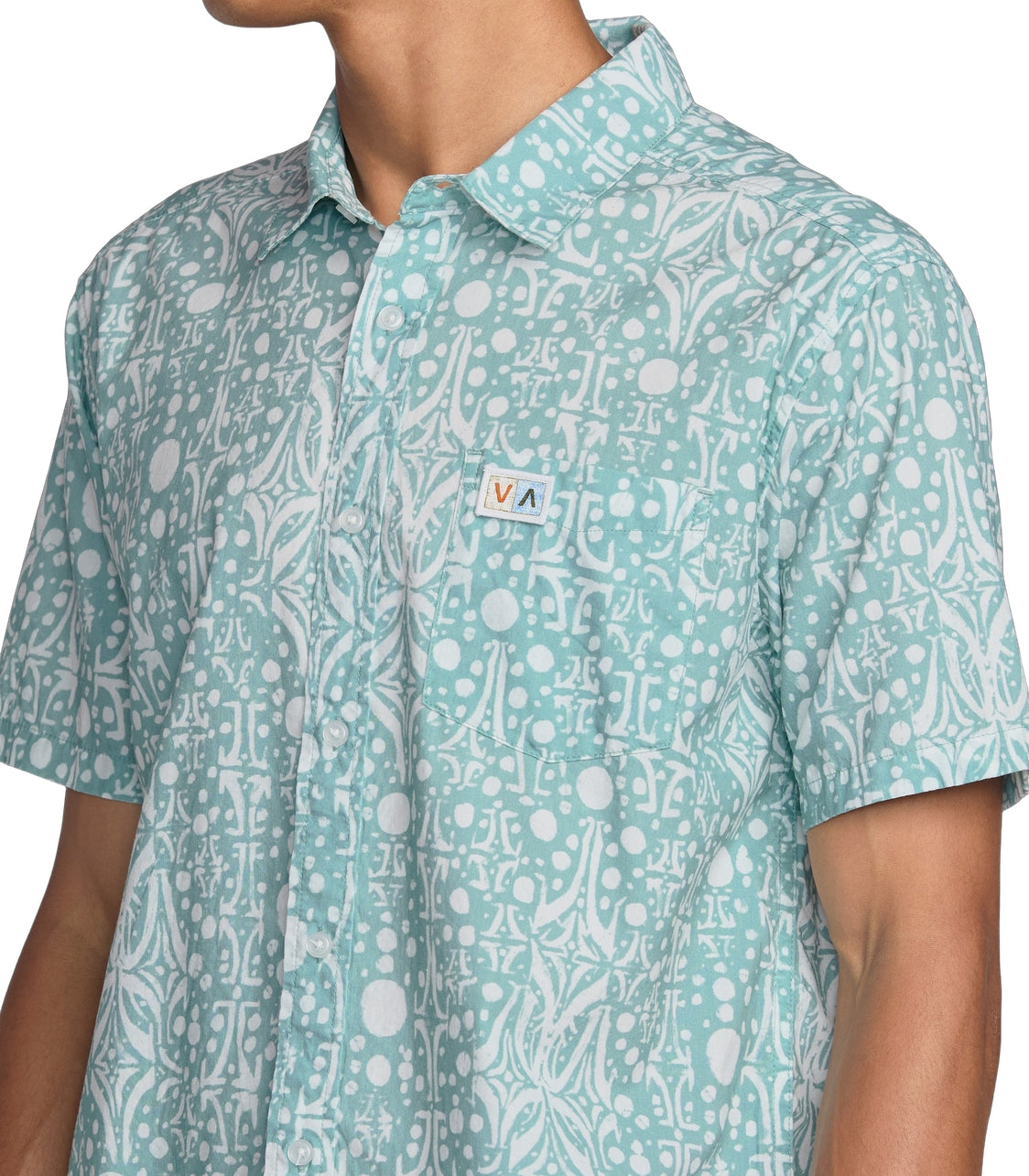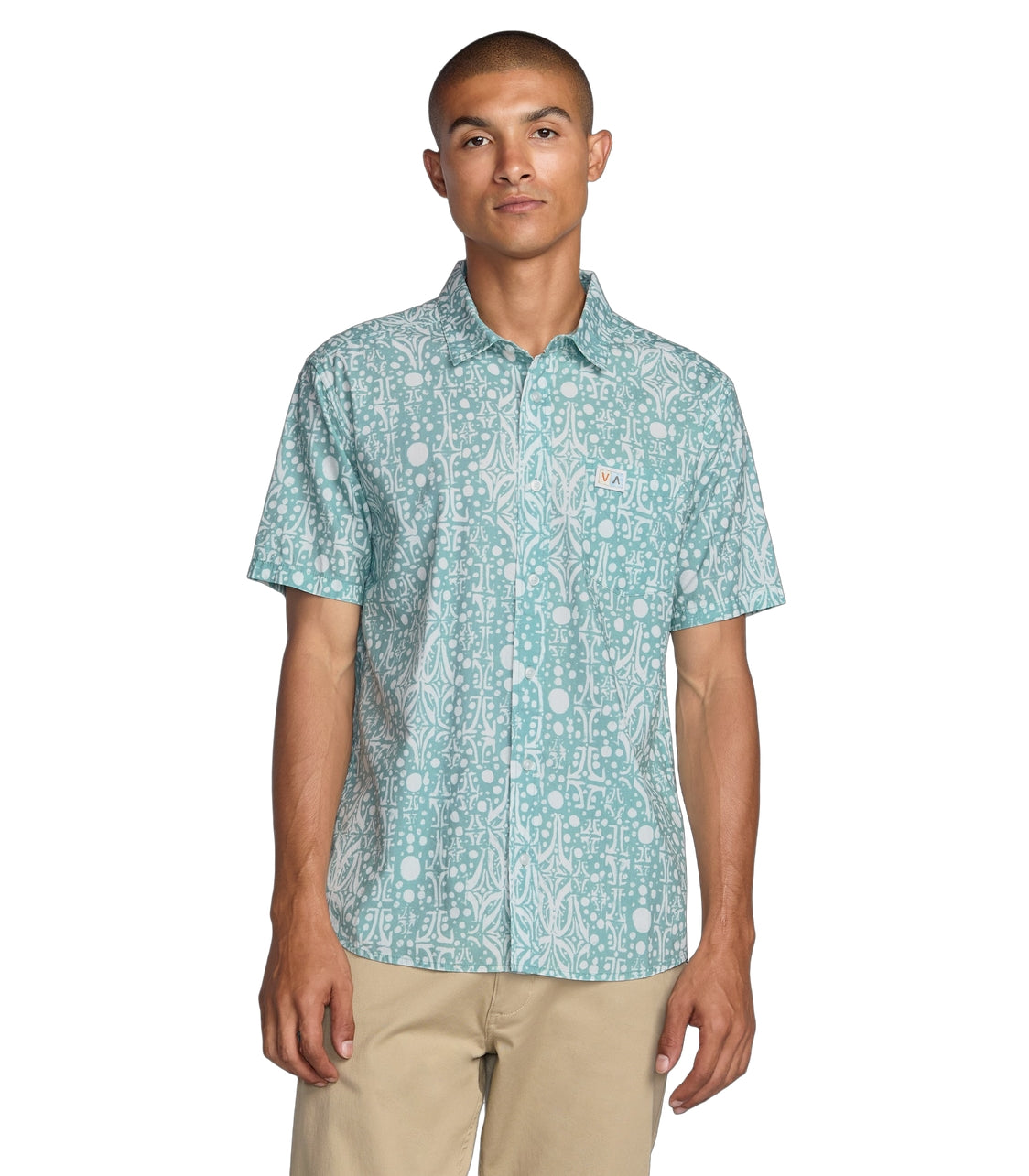 RVCA Jacobs Archive Print Short Sleeve Polo features 55% cotton and 45% viscos fabric. It has a regular fit with a traditional collar, scalloped hem, and single chest pocket. RVCA solo label at left pocket hem.