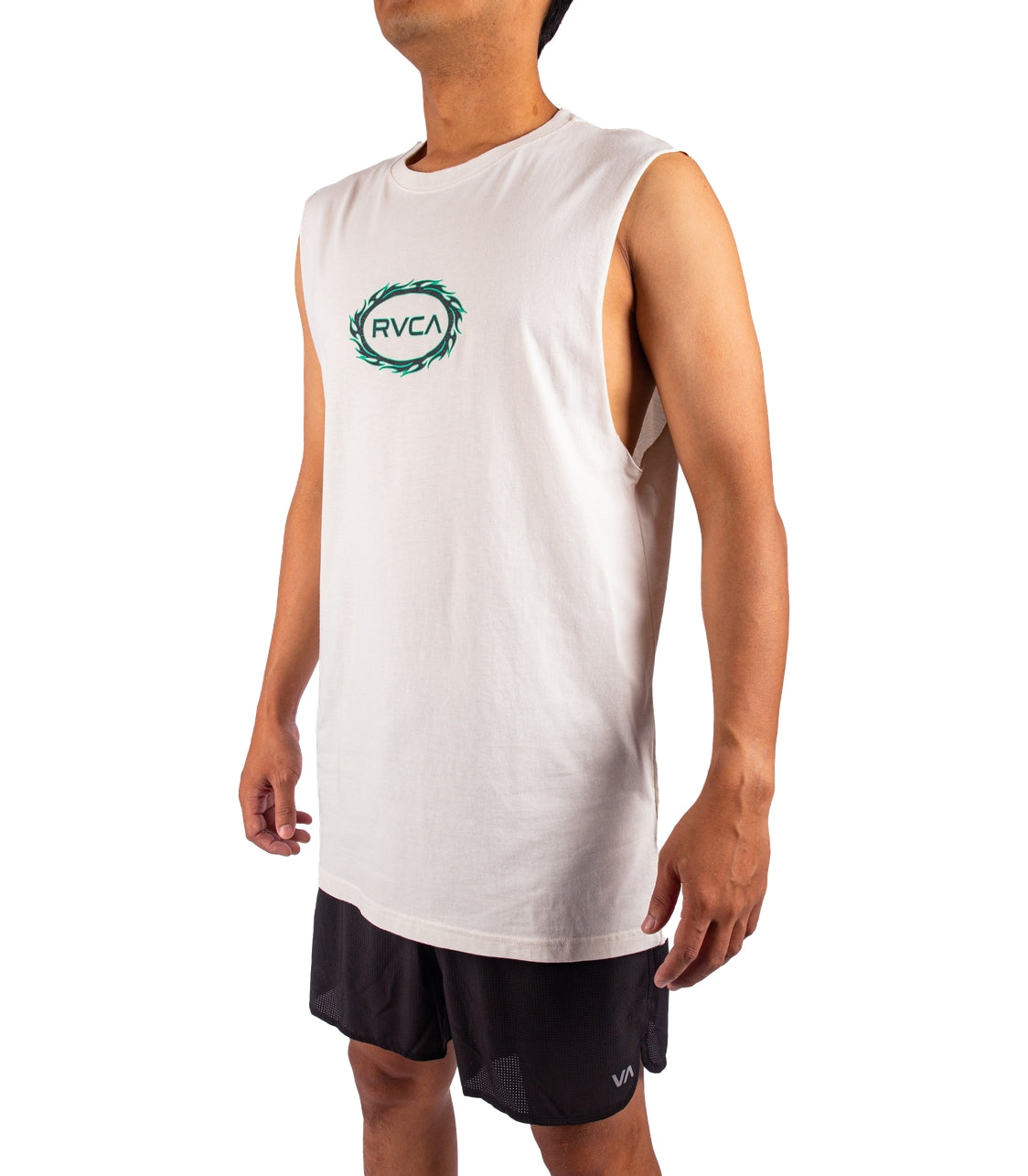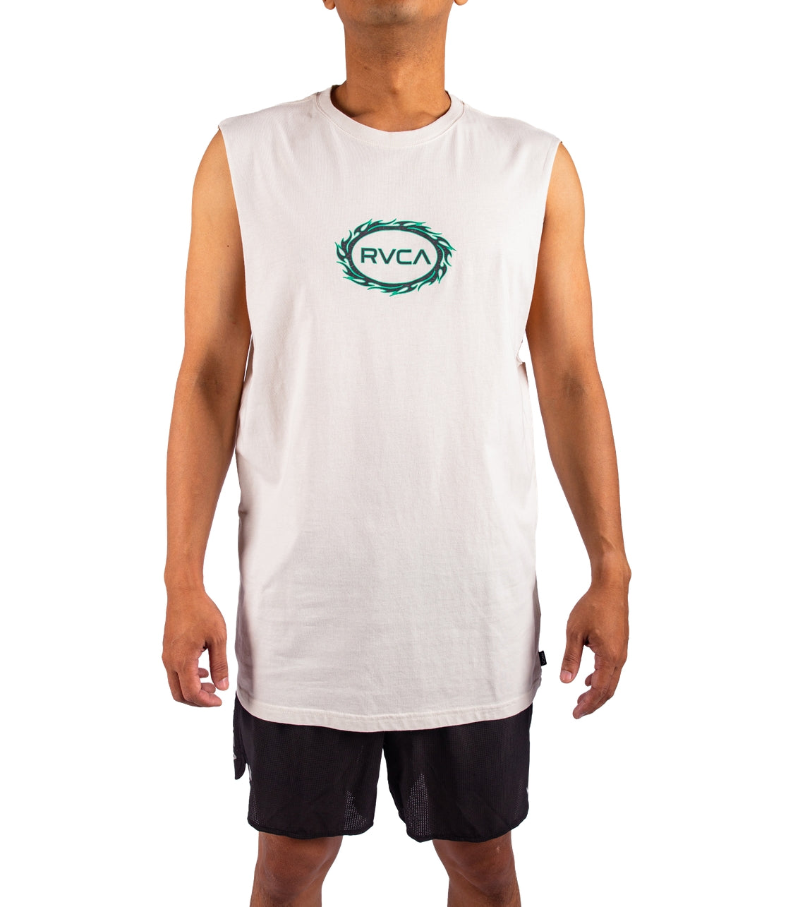 RVCA Tribal Spin Muscle Tee features 100% Cotton fabric, with a regular fit style, garment softener wash / butter wash, and cracked and soft plastisol ink.